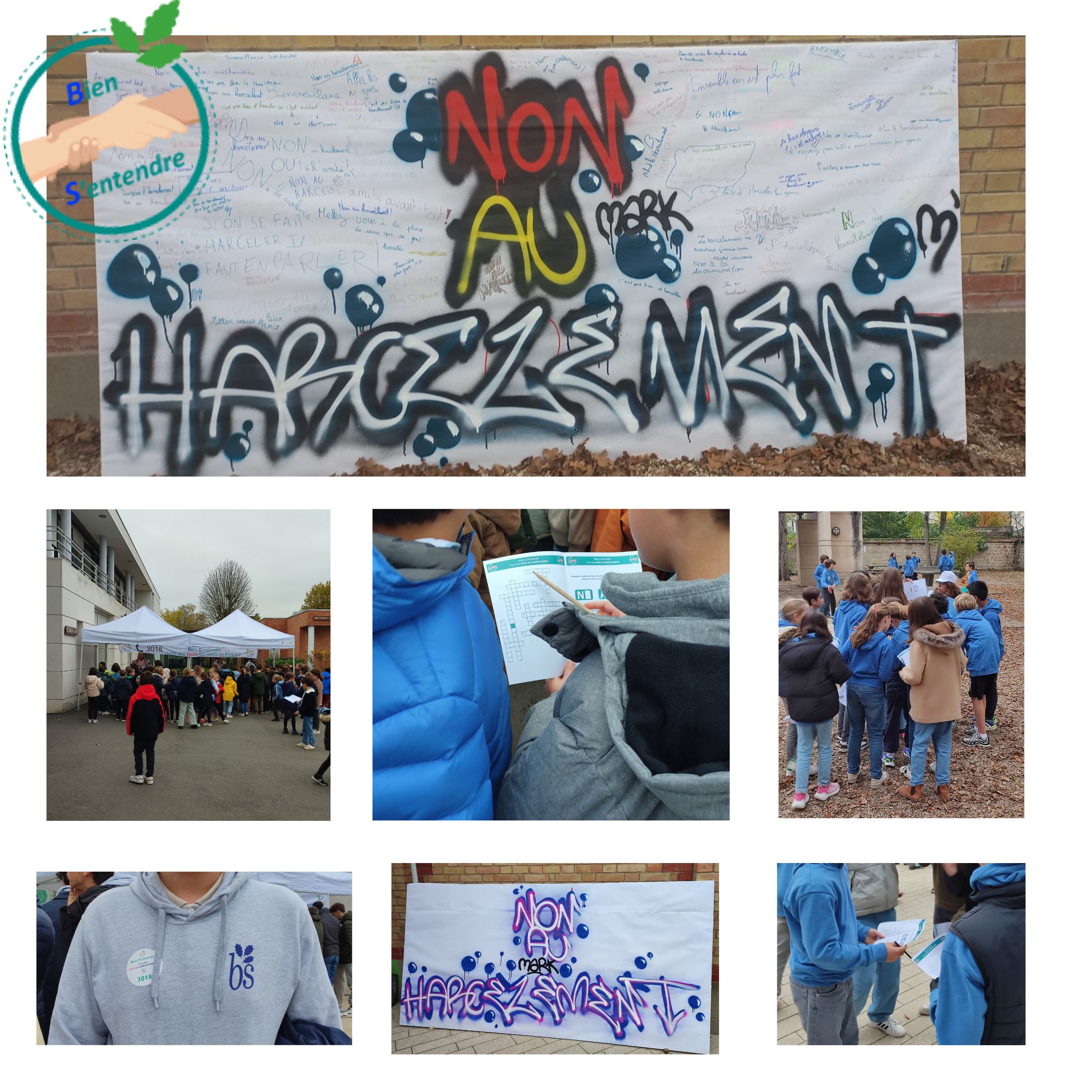 Jeudi 9 novembre, l'ensemble de l'établissement s'est encore mobilisé contre le harcèlement : en portant le sweat BS, en collant le sticker reprenant le slogan "Non au harcèlement", une sonnerie spécifique a été diffusée, et deux photos de groupe ont été prises !